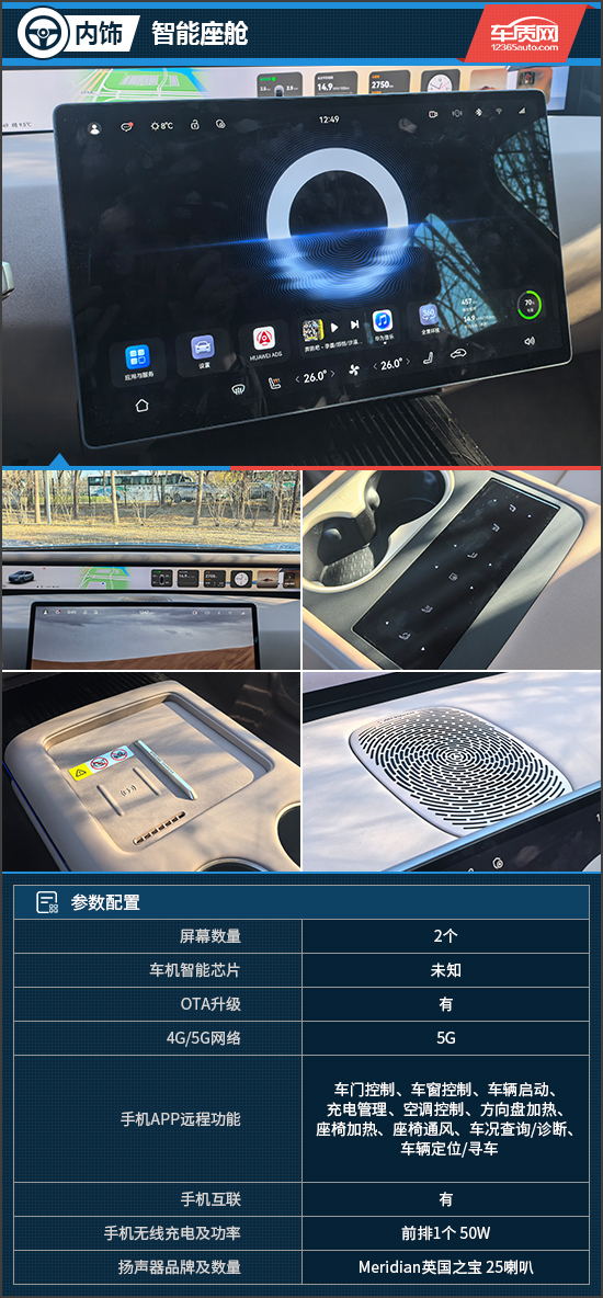 评测车配备35.4英寸全景远端屏和15.6英寸中控屏,不仅界面美观且显示清晰。车机内置华为HarmonySpace 5系统,内置超级桌面,可进行四区域语音唤醒识别。通过唤醒词“小塔小塔”开启互动,能控制导航、电话、空调、车窗等功能,且支持语音连续识别、可见即可说,交互感受出色。此外,前排中控台上方设置了1个手机无线充电板,拿放手机十分方便,且充电功率达到50W。对于音效有更高需求的消费者而言,评测车的25喇叭Meridian英国之宝音响可谓充满诱惑力。