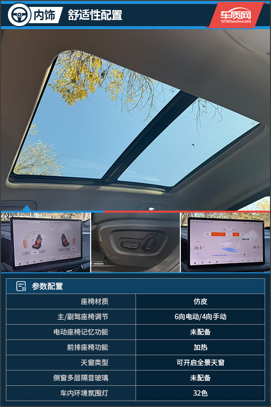 舒适性配置方面,评测车搭载了可开启全景天窗,采光效果出色并且兼备通风能力。前排仿皮座椅内部填充柔软,功能方面配备了三档加热,并且支持智能模式,可自动调节加热档位,使用体验更加便捷。