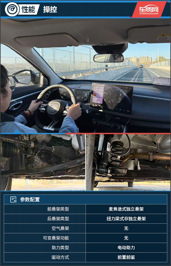 评测车的悬架系统由前麦弗逊式独立悬架+后扭力梁式非独立悬架组成。实际体验,悬架对于路面细碎颠簸处理比较得当,但面对减速带等较大坑坎时,车内振动明显增加。好在座椅填充柔软,配合较厚的胎壁,能够起到缓解作用,确保乘坐舒适。
