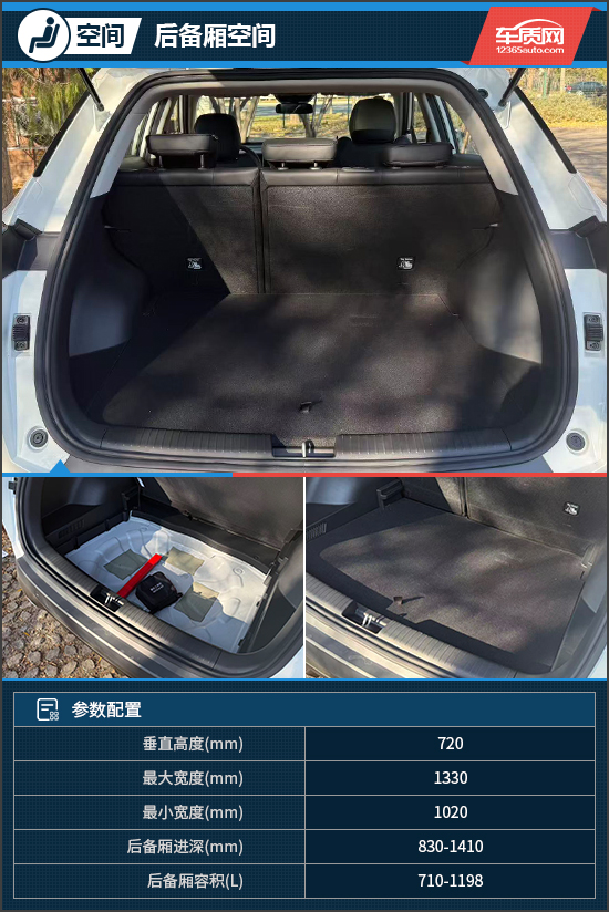 后备厢内部规整,常规状态下容积为710L,能容纳4-5个登机箱。后排座椅按4/6比例放倒后,容积提升至1198L,可以形成一个纯平空间,秒变大床房。此外,后备厢盖板可调节高度,下方为一个储物空间,私密性较强。