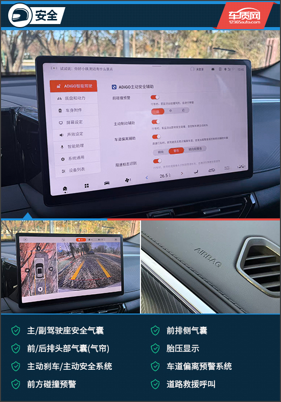 安全配置方面,评测车提供了较为丰富的主/被动安全配置。诸如前排侧气囊、前/后排头部气囊(气帘)、车道偏离预警系统、前方碰撞预警等在评测车上均有配备,能够为日常行驶保驾护航。
