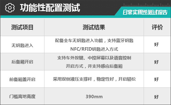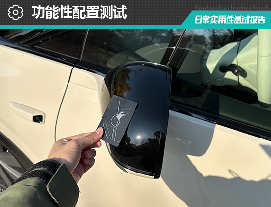 在功能性配置方面,评测车配备了全车无钥匙进入功能,并支持蓝牙钥匙、NFC/RFID钥匙进入方式,用户只需将钥匙贴在左侧外后视镜感应区域,车辆便可自动解锁,反之则自动上锁。上述操作在实测过程中并未出现失灵的情况。