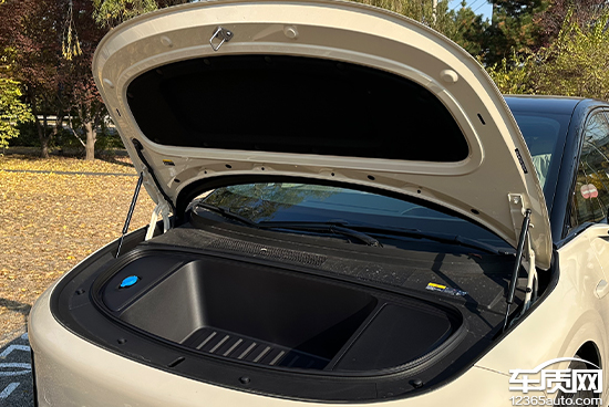 评测车的前备厢盖未设置机械开启开关,只需敲击2次前备厢盖或者通过中控屏幕以及语音控制进行解锁,随后直接掀起前备厢盖即可。操作过程中,由于其采用了双侧液压支撑杆,并且重量较轻,操作起来比较省力。