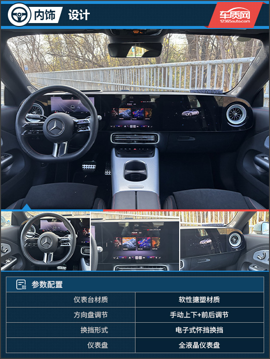 评测车的座舱采用时下流行的极简设计理念,软性材质与金属纹理饰板搭配得当,整体氛围既现代又富有精致感。全新的MBUX超级屏由10.25英寸全液晶仪表盘、14英寸中控屏以及14英寸副驾娱乐屏组成,圆润的边角设计十分可爱,也进一步强化了科技氛围。值得肯定的是,中控区域依然保留部分物理按键,在驾驶过程中能提供更便捷的盲操作体验。按键后方设置了手机无线充电板,紧随其后的是设计巧妙的杯架,其限位结构可伸缩折叠,能够适应不同尺寸的水杯或饮品容器,实用性表现不错。