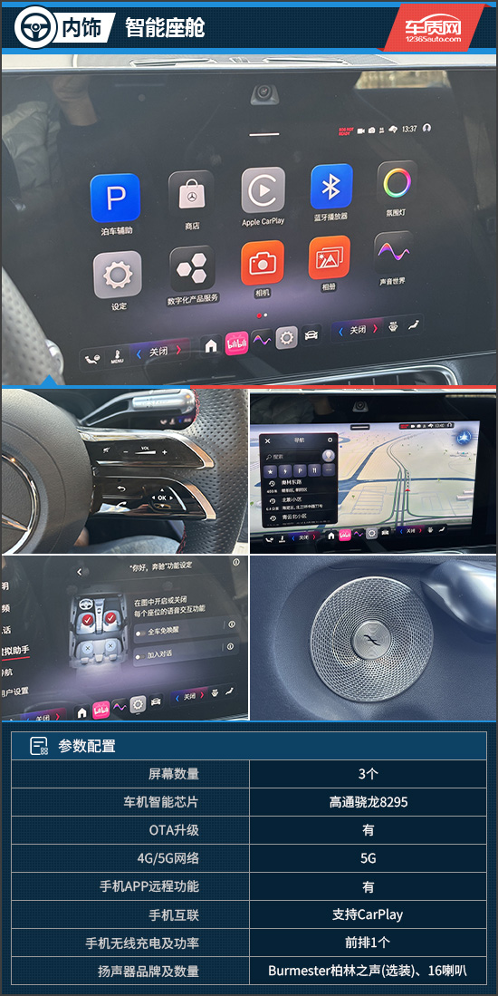 评测车的车机内置全新MB.OS操作系统及高通骁龙8295芯片,专为中国市场定制开发,软件生态十分丰富。奔驰虚拟助手基于“豆包”生成式AI和思必驰语音技术打造,可实现0.2秒超快唤醒和0.8秒执行速度,交互更自然、识别更精准。此外,车内选装了柏林之声音响系统,搭配16个扬声器,并标配“SoundExperience”整体式音效,提供六种个性化模拟声浪,打造了属于电动时代的澎湃声场体验。