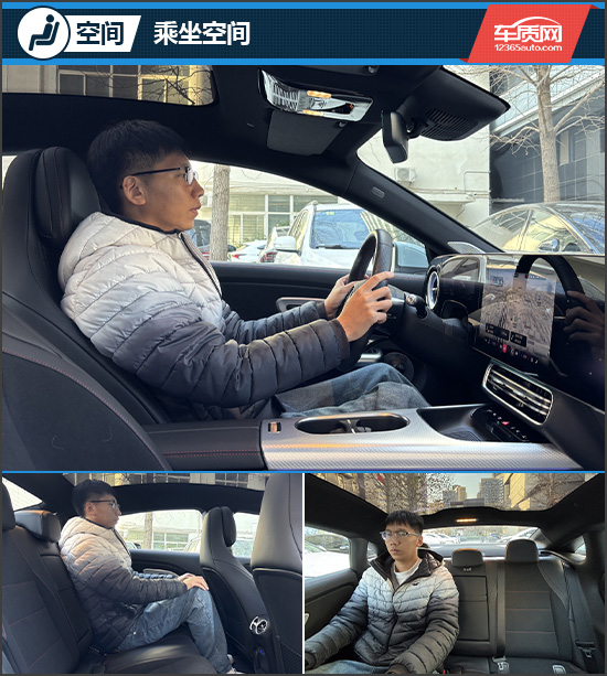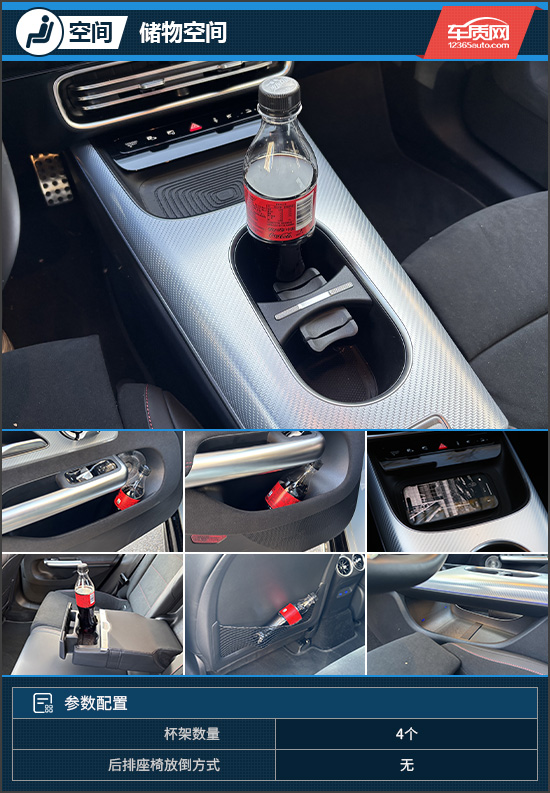 在乘坐空间方面,身高181cm的体验者调整好前排座椅后,无论横向还是纵向空间均十分充裕。保持前排位置不变,体验者进入后排后,头部空间约为3指、腿部空间约为1拳3指。虽然评测车定位为紧凑型车,但得益于加长的40mm轴距以及纯电平台对空间布局的优化,其后排乘坐空间并不局促。此外,中央扶手内集成了带有限位器的隐藏式杯架,固定水瓶等容器十分稳固。