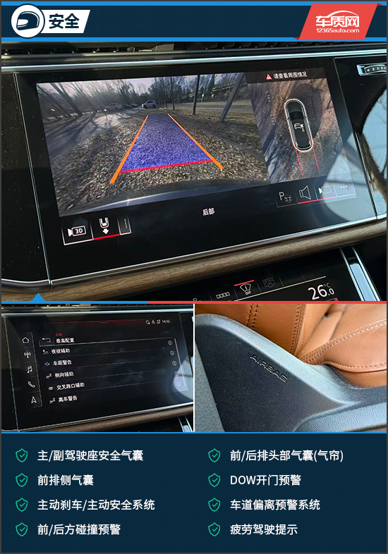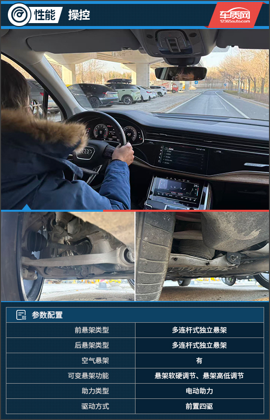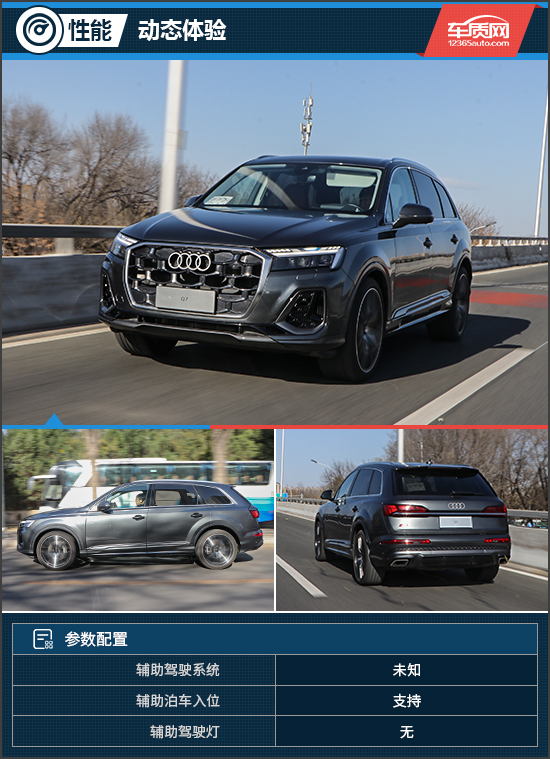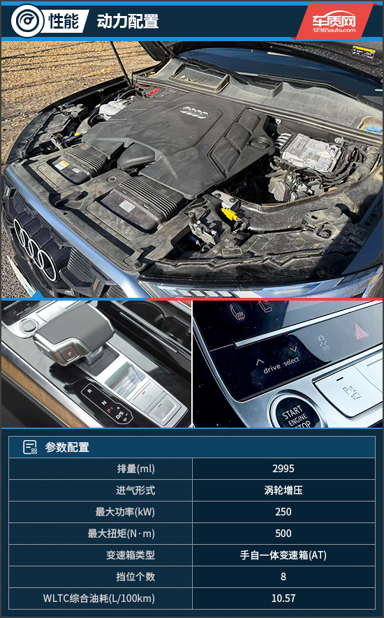 评测车搭载3.0T涡轮增压发动机+48V轻混系统,最大功率250kW,最大扭矩500N·m。与之匹配的传动系统为8速手自一体变速箱,并标配带有机械扭矩限滑差速器的quattro全时四驱系统。
