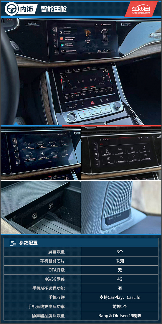 纵置双屏幕由上方的10.1英寸多媒体中控屏+下方8.6英寸空调控制屏组成,支持触控振动反馈,有效避免了误操作,提升人机交互的质感与效率。车内搭载的Bang&Olufsen音响系统表现不俗,中高频清澈透亮,低频也拥有足够的量感与弹性。