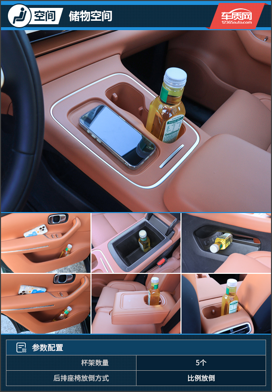 储物空间令人满意,不仅储物数量多,而且位置合理,拿取物品便捷。前排杯架的左侧还设置了手机无线充电板。另外,后排的杯架设置在空调出风口的上方,而中央扶手首创“宝宝餐桌”,可放置大口径杯、吸盘碗等物品,在带娃出行时使用非常方便。
