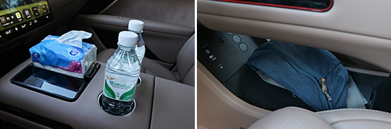 对于车内使用空间的测试,只针对前排触手可及的空间,不包括手套箱、中央扶手箱等需开启的空间。测试方法是将以下固定物品全部放置在前排的各个储物空间内,通过固定物品的放置情况来判断车辆储物空间的表现。测试选定的固定物品为:2瓶常规大小的矿泉水、1部大屏手机、1支口红、1个挎包、1副墨镜、1把折叠雨伞以及1包常规尺寸的抽纸。