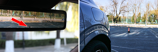 后方视野测试中,依旧将桩桶固定摆放,随后移动车辆直至可以观察到桩桶上沿为止。经实测,得益于流媒体后视镜,评测车后方视野所测得的距离为7.195m,在测试过的同级别车型中处于上游水平。