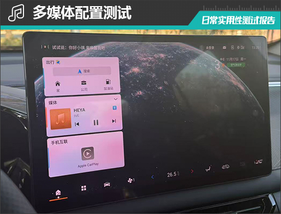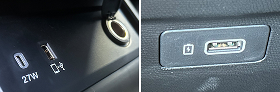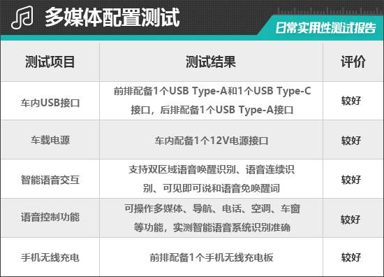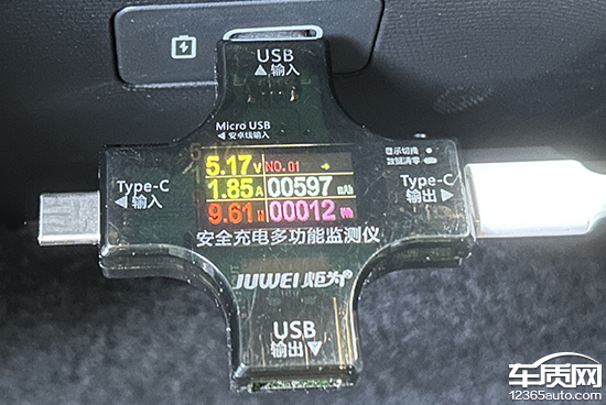 评测车共配备3个USB接口,其中,前排配备1个USB Type-A接口和1个USB Type-C接口,后排配备1个USB Type-A接口。同时,前排还配备1个12V电源接口,能够满足车内乘客多种电子设备的用电需求。