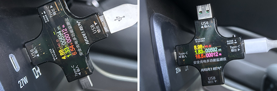 此外,我们对USB接口进行了测试。其中,前排USB Type-A接口充电功率为6.54W,电压为4.88V,电流为1.33A;USB Type-C接口的充电功率为16.5W,电压为8.98V,电流为1.83A。后排USB Type-A接口的充电功率为9.61W,电压为5.17V,电流为1.85A。