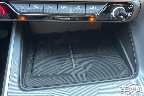 评测车前排杯架前方配备了1个手机无线充电板,位置设计合理,驾驶员拿放手机方便。充电功率为50W,提供通风散热口和开启/关闭功能,实用性不错。