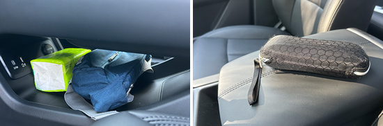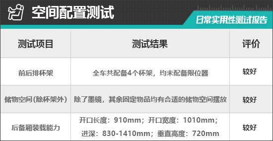 经过实测,除了墨镜,其余固定物品均有合适的储物空间进行摆放,并且位置设计比较合理,拿放物品方便。评测车不仅中控台下方的储物槽空间较大,在杯架前方还设有一个储物槽,可以放置卡片或手机等物品,实用性得到进一步提升。