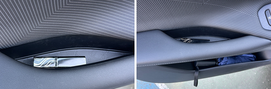 对于车内使用空间的测试,只针对前排触手可及的空间,不包括手套箱、中央扶手箱等需开启的空间。测试方法是将以下固定物品全部放置在前排的各个储物空间内,通过固定物品的放置情况来判断车辆储物空间的表现。测试选定的固定物品为:2瓶常规大小的矿泉水、1部大屏手机、1支口红、1个挎包、1副墨镜、1把折叠雨伞以及1包常规尺寸的抽纸。