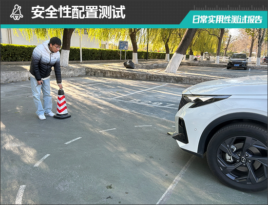 在前方视野测试中,我们采用高70cm的桩桶作为参照物,随后调整车距,直至在主驾驶位可以看到桩桶上沿。经过测试,桩桶与车头最终测得的数据为2.711m,在测试过的同级别车型中处于中下游水平。