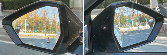 评测车的左/右外后视镜均采用普通镜片,经实测,左、右外后视镜视野范围分别为24.4°和19.8°,在测试过的同级别车型中分别处于中游和中上游水平。