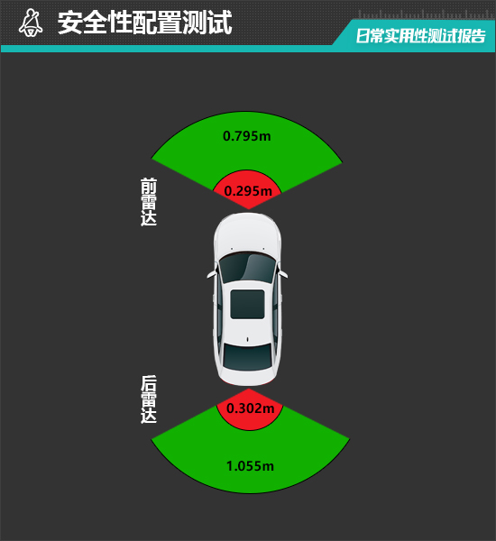 前雷达最远可以在0.795m处感应到前方物体,雷达功率表现一般;最近端感应距离为0.295m,表现同样未达到同级别车型平均水平。
