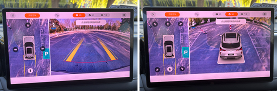 评测车配备了360度全景影像和透明底盘/540度影像,支持多角度查看,方便驾驶员了解车辆周边情况。经实测,影像显示清晰,车辆周围的畸变控制也在合理范围内,整体表现达到行业平均水平,可以在泊车时给驾驶者提供帮助。