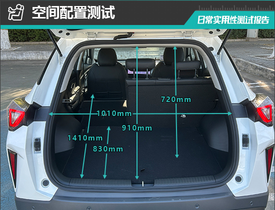 后备厢内部造型较为规整,地板平整度不错。后排座椅支持比例放倒,放倒后可以进一步拓展后备厢空间。对于评测车后备厢的基础数值,我们也进行了实测,开口长度为910mm;开口宽度为1010mm;后备厢进深为830-1410mm;后备厢地台与顶部的垂直高度为720mm。