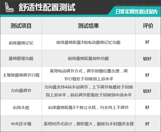 在主驾驶座椅测试中,评测车的主驾驶座椅最前端和最末端之间的距离为260mm,在测试过的同级别车型中处于上游水平,能够满足大部分驾驶者的使用需求。