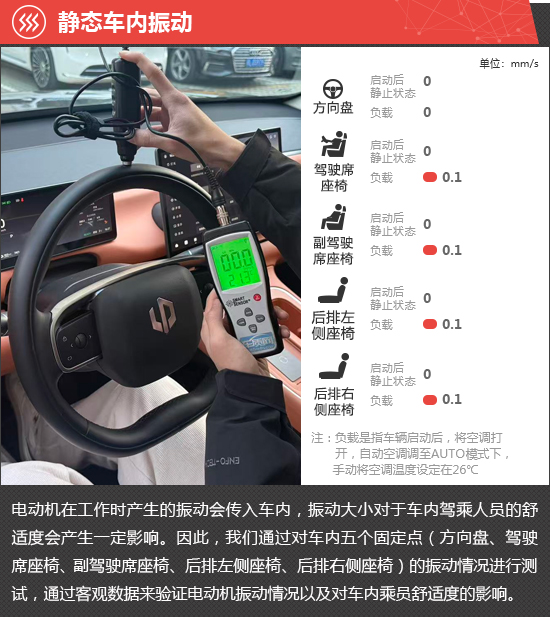 在静态车内振动测试环节,怠速和负载两种状态下,方向盘处的振动数值始终为0。同时,车内座椅的振动数值也处于较低水平且两种状态下变化不大,对乘坐舒适性几乎没有影响。