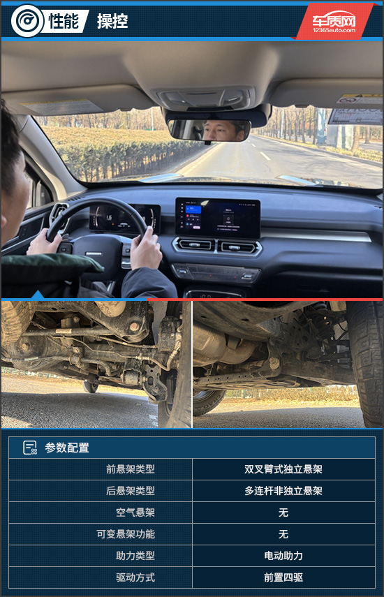 评测车基于坦克平台打造,采用非承载式车身结构,抗扭刚度较前代提升30%,面对各类非铺装路面毫无压力,越野性能出色。悬架方面,前部采用双叉臂式独立悬架,后部更改为多连杆非独立悬架,与老款车型相比,对于路面颠簸的处理更为从容,同时兼顾后排乘坐舒适性。