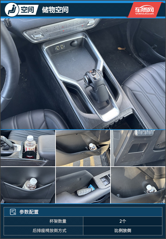 储物方面,评测车能够满足日常使用需求。中央扶手箱采用上掀式设计,纵深表现优秀;门板储物空间宽敞,并加入隔断结构,便于整齐放置物品。换挡杆两侧及方向盘左下方还设有储物格,结合封底式门把手,全车有多处可随手置物的空间,使用非常顺手。