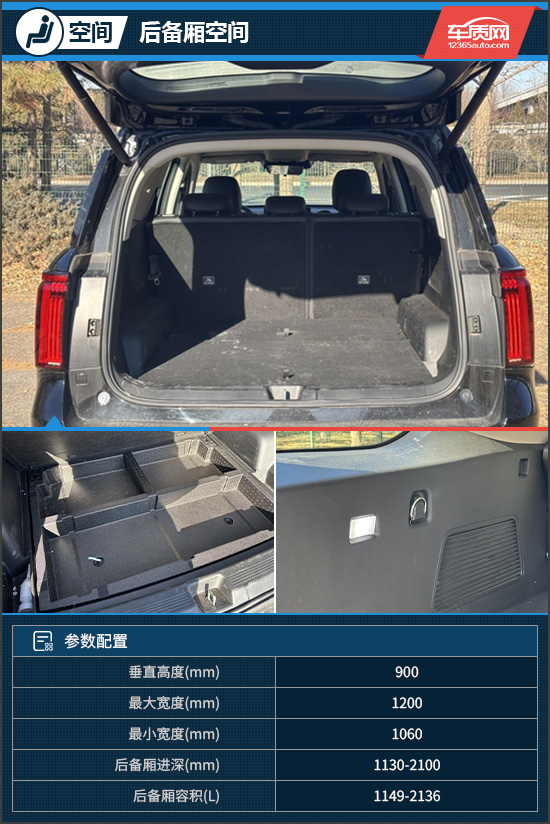 后备厢内部空间规整,依托超长进深,标准状态下实测容积为1149L;后排座垫掀起并完全放平座椅后,容积可扩展至2136L,装载能力十分强悍。同时,隔板下方还预留隐藏储物空间,进一步提升灵活性与私密性。