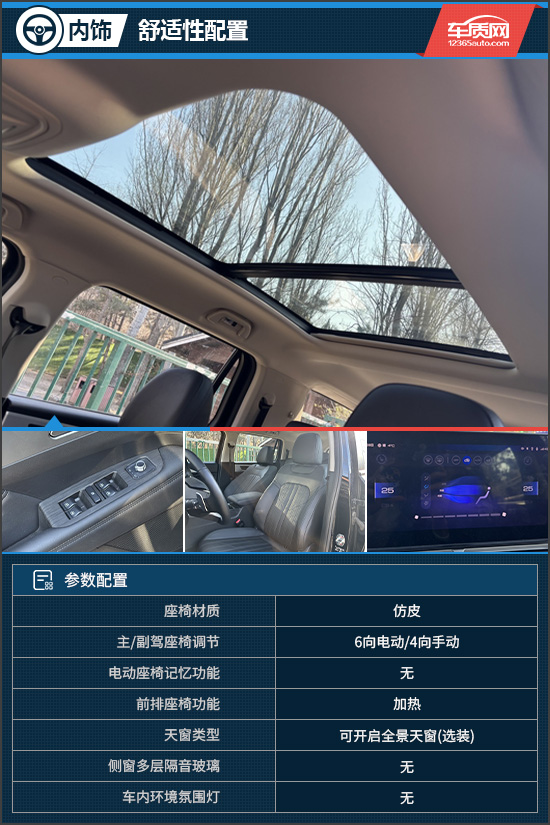 舒适性配置方面,评测车选装了可开启全景天窗并配有电动遮阳帘,座舱通透的同时可有效防晒。前排座椅支持加热功能,在寒冷环境下用车十分友好。此外,其还将手动空调升级为自动空调,带来了更舒适的驾乘体验。