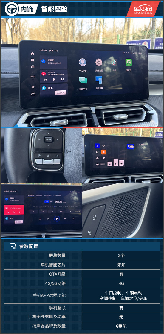 评测车搭载12.3英寸多媒体中控屏,车机内置腾讯TAI3.0系统,支持智能语音交互和OTA在线升级。同时还安装了抖音、爱奇艺等APP,并支持手机互联/映射,能够带来主流的娱乐体验。此外,车内扬声器数量从老款车型标配的4喇叭提升至6喇叭,音响表现有所增强。
