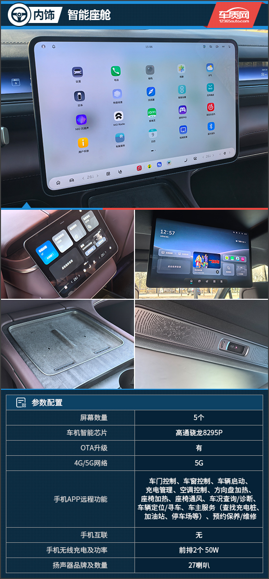 评测车配备15.6英寸中控屏,分辨率达到3K,车机内置最新的雪松系统,在高通骁龙8295P芯片加持下,响应速度相当快,可实现六区域语音唤醒识别,交互体验出色。仪表台两侧的Skyline数字天际线自适应超窄屏,方便主驾、副驾用户快速获取车辆状态、路况提示等关键信息。搭配后排的21.4英寸车顶屏幕和8英寸控制屏,使车内屏幕数量达到5个。此外,前排中控台上方设置有2个50W手机无线充电板,充电便捷;27喇叭组成的音响系统支持杜比全景声,听觉体验大幅提升。