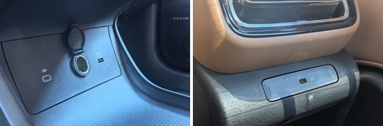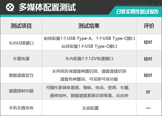 评测车共配备3个USB接口,其中,前排配备1个USB Type-A接口和1个USB Type-C接口,后排配备1个USB Type-C接口,后排接口数量略显不足。同时,车内还有1个12V电源接口,基本能够满足车内乘客电子设备的用电需求。