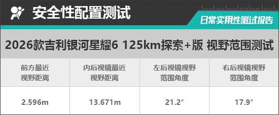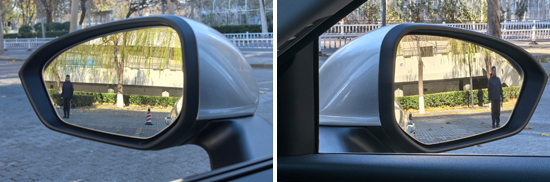 评测车左、右外后视镜均采用普通镜片。经实测,左、右外后视镜视野范围分别为21.2°和17.9°,在测试过的同级别车型中,分别处于同级别下游、中下游水平。