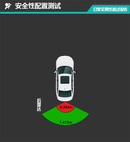 在雷达测试过程中,评测车的后雷达最远可在1.415m处感应到后方物体,雷达功率表现中规中矩。从实测数据来看,后雷达最近提示距离为0.303m,表现未达到同级别车型平均水平。