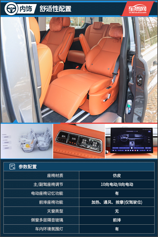 舒适性方面,前排采用7层材质的人体工程学座椅,标配加热、通风、主驾驶按摩,搭配航空软枕,再加上主副驾配备的双层隔音玻璃,全方位保障驾乘舒适性。第二排座椅功能配置堪称“移动头等舱”水准,除加热、通风、按摩外,还支持一键开启零重力模式,搭配无级调节腿托,长途乘坐也能轻松躺平休息。再加上可折叠小桌板,商务办公、孩子写作业等需求都能满足。