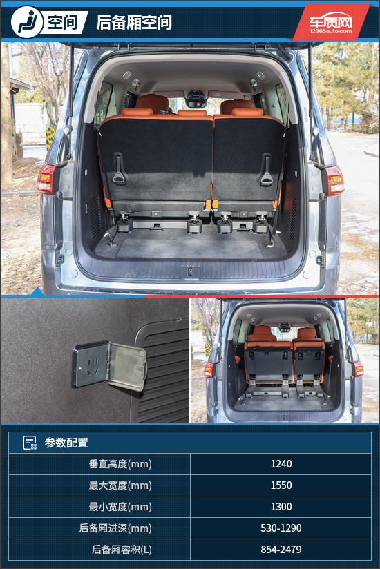 打开后备厢,地台比较平整,常规状态下容积为854L,轻松容纳3-4个登机箱。将第三排座椅按比例放倒后,虽然无法做到纯平,但纵向拓展能力出众。