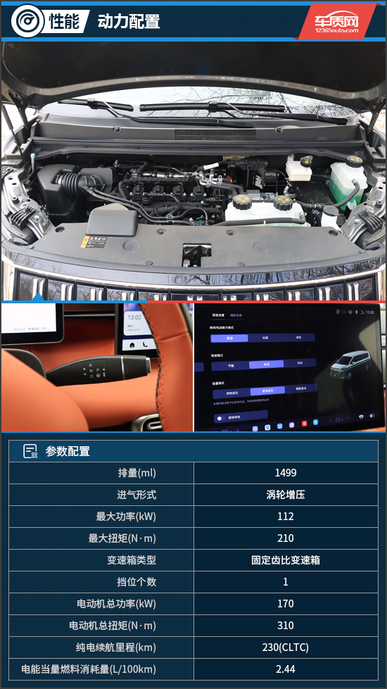动力方面,评测车搭载由1.5T涡轮增压发动机+后置单电机组成的增程式动力总成,发动机最大功率112kW,电动机总功率170kW,电动机总扭矩310N·m,CLTC纯电续航里程230km,CLTC综合续航1420km。