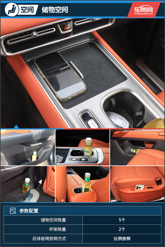 储物空间同样亮眼,前排空调出风口下方设有两个手机槽,左侧为50W无线充电板,后方配有两个水杯架。中央通道下方采用掏空设计,可容纳较大体积物品,颇具实用性。第二排除门板上的水杯架外,前排座椅中间位置还设有两个水杯架,数量丰富。同时,座椅内侧还设有两个小型储物槽,可用来放置手机。
