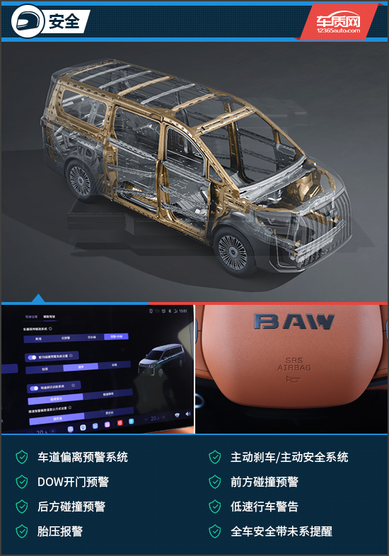 安全配置方面,评测车配备车道偏离预警系统、主动刹车/主动安全系统、前方碰撞预警以及胎压报警等,可有效提升行车安全性。另外,锐胜M8增程版配备了75%高强度钢车身和“金刚盾”耐冲击电池壳体,打造出坚固的乘员保护笼,安全感拉满。