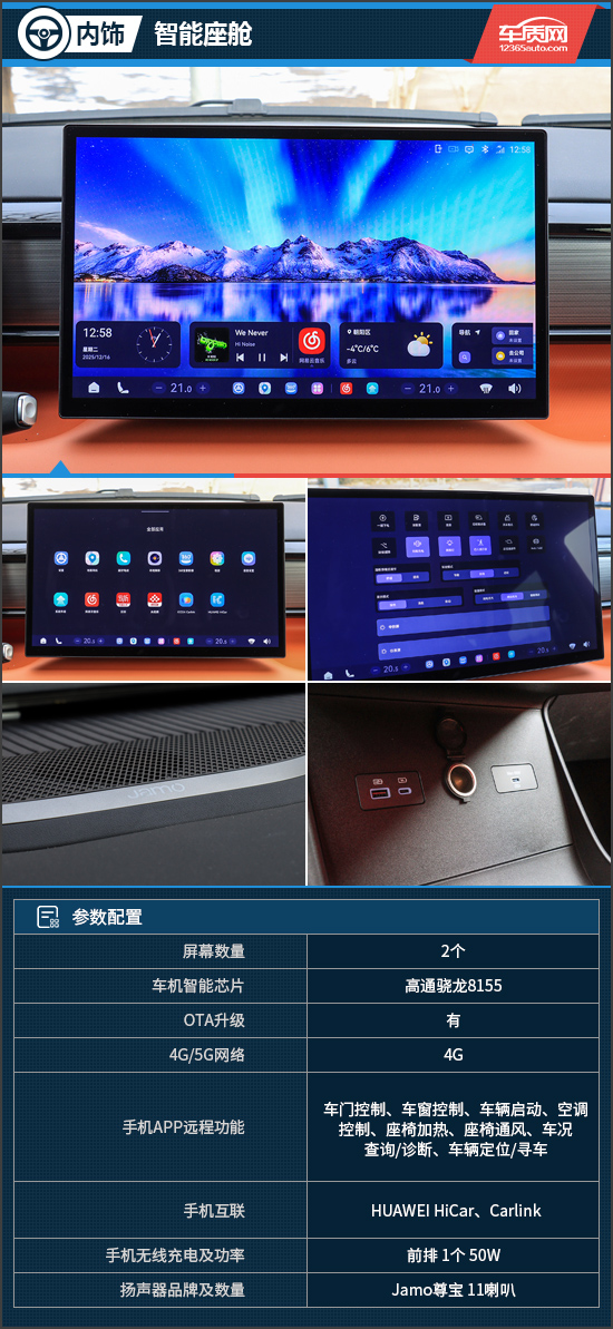 另外,评测车搭载丹麦Jamo尊宝音响系统,配合11个扬声器,内置4种专业预设音频调音模式以及自定义调音功能,能够精准还原不同风格音乐的细节质感。