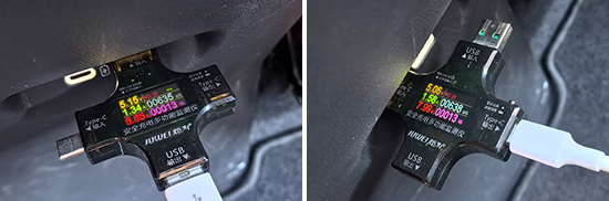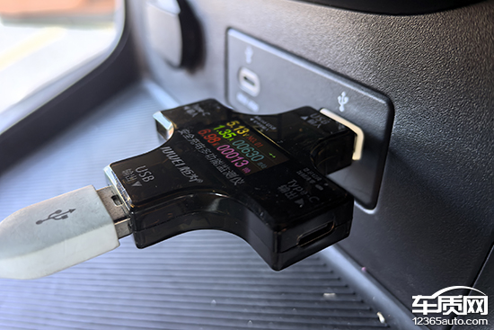 同时,我们对USB接口的电压、电流和功率进行了测试。前排USB Type-A接口充电功率6.98W,电压5.13V、电流1.35A。后排USB Type-A接口充电功率6.85W,电压5.15V、电流1.34A;后排USB Type-C接口充电功率7.99W,电压5.06V、电流1.58A。