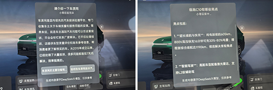 经过实测,评测车无法识别指着副驾车窗说“打开这个”、我有点饿了以及我有点不太舒服三条固定语音指令,对于其他语音指令均可识别并执行。具体来看,对于“导航到北京站东街”这样容易混淆的复杂指令,系统可以排除干扰正确理解;同时,当提出“导航到附近大众点评得分4.5分以上的川菜馆”的指令时,系统也能够进行精确筛选。除此之外,评测车在智能交互方面的表现也十分亮眼,无论是“请介绍一下车质网”还是“零跑C10都有哪些亮点?哪款配置性价比最高?”,系统都能给予丰富的内容反馈。此外,评测车还支持双区域语音唤醒识别、语音免唤醒词、语音连续识别以及可见即可说等功能,日常使用十分方便。