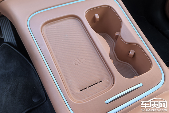 评测车在中控台下方配备了1个50W手机无线充电板,用户可以通过中控屏内的虚拟按键或语音指令控制开关。值得一提的是,手机无线充电板还配备了通风散热口,实用性表现不错。