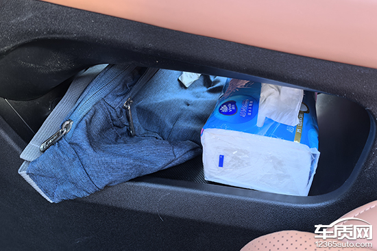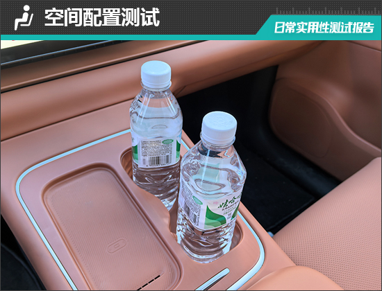 经过实测,评测车的车内储物空间数量较多,除墨镜外,其余固定物品均能找到合适的位置存放,整体表现令人满意。值得一提的是,评测车共配备5个杯架,均带有限位器。