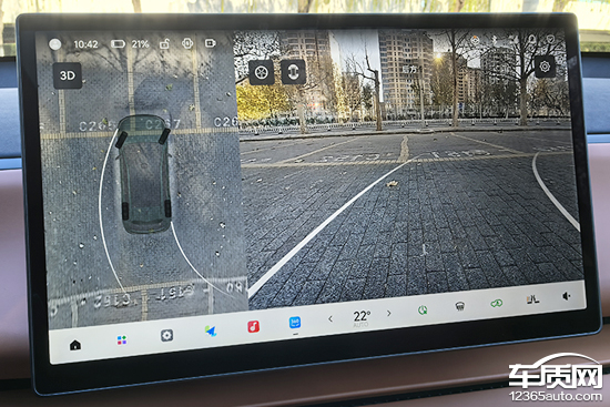 评测车配备360度全景影像,画面清晰度和畸变控制都能令人满意。同时,该影像支持3D画面显示以及多角度查看,并提供可随动转向的倒车辅助线,帮助驾驶者更轻松地完成倒车入库等操作,实用性表现不错。
