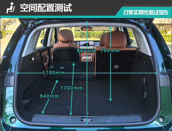 后备厢内部造型规整,地板平整度不错。后排座椅支持比例放倒,放倒后可以进一步拓展后备厢空间。对于评测车后备厢的基础数值,我们也进行了实测,开口长度为840mm;开口宽度为1100mm;后备厢进深为940-1700mm;后备厢地台与顶部的垂直高度为700mm。