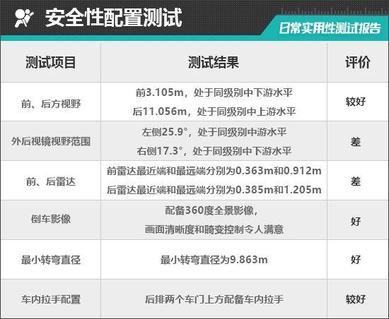在车辆前、后方视野测试中,车内所有座椅均已调整至最低状态,所测出的数据与驾驶者正常使用时均有一些偏差,仅供参考。