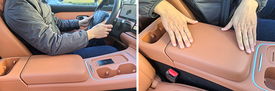 前排中央扶手箱采用上掀式设计,整体面积较大,并且采用软质材料包覆,触感舒适。虽然中央扶手箱不支持前后移动或上下角度调节,但在正常驾驶坐姿下,依然能够给驾驶员的手肘提供有效支撑。
